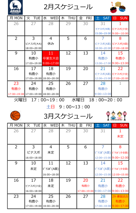 | 持ち物 | 室内履き 動きやすい服装 タオル 水筒 ボールは貸出もあります。 入部後バスケットシューズを ご用意ください。 |
