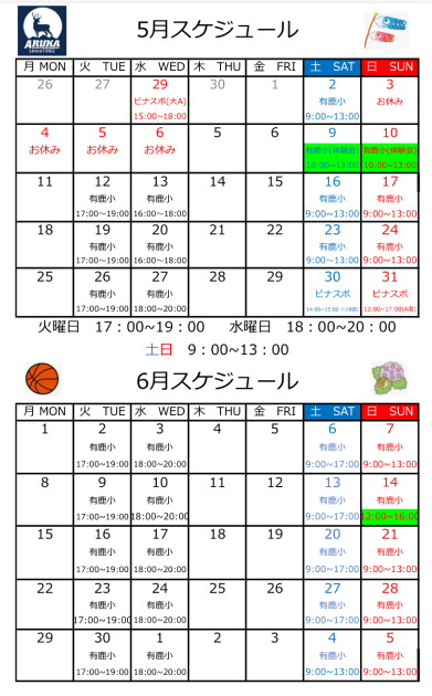 | 活動日 | (火)・(水) 上記のスケジュールをご確認お願いします。ビナスポの予約状況によって変わります (土)・(日)・(祝) 13:00〜17:00 or 17:00~20:00 |